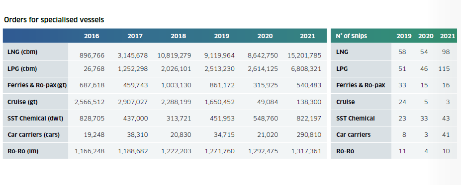 同時,去年除郵輪外的特種船市場表現(xiàn)十分活躍。2021年LNG船新船訂單量達(dá)到98艘1520萬立方米,其中12艘為LNG加注船。LPG船訂單量也達(dá)到了創(chuàng)紀(jì)錄的135艘。不銹鋼化學(xué)品船和汽車運(yùn)輸訂單量均高于前幾年,而郵輪訂單幾乎消失。