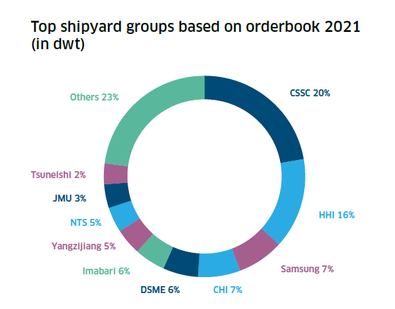 目前,全球活躍船廠(年內(nèi)接獲新訂單和/或交付新船的船廠)數(shù)量為274家,比2020年增加了4家,但僅為2007年最高約700家的40%左右。截止2021年底,全球手持訂單量從2020年底的1.8億載重噸(2003年以來最低數(shù)字)增至2.23億載重噸。